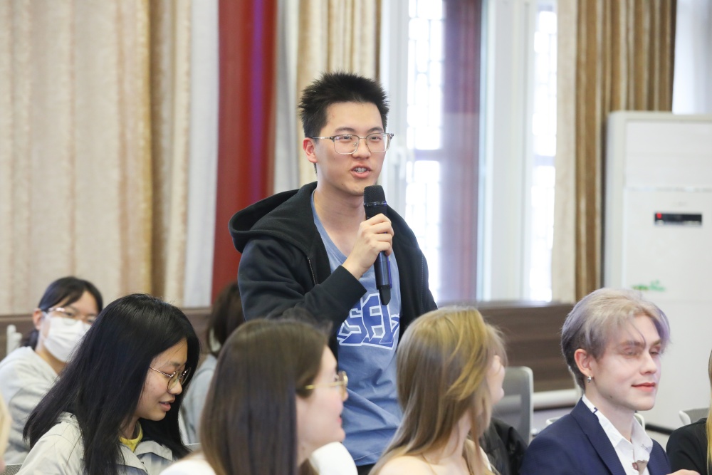 进入自由提问环节,学生相继就俄罗斯高等教育改革动向、两校合作前景、国际化语言人才培养路径等议题提问。代表团成员逐一回应,内容充实恳切,会场掌声不断。期间,当学生提出建立两校交换生项目的建议时,尼基塔·阿尼西莫夫校长明确表示,两校正稳步加深伙伴关系,推进建立协同机制,各层面、多维度的合作指日可待。
