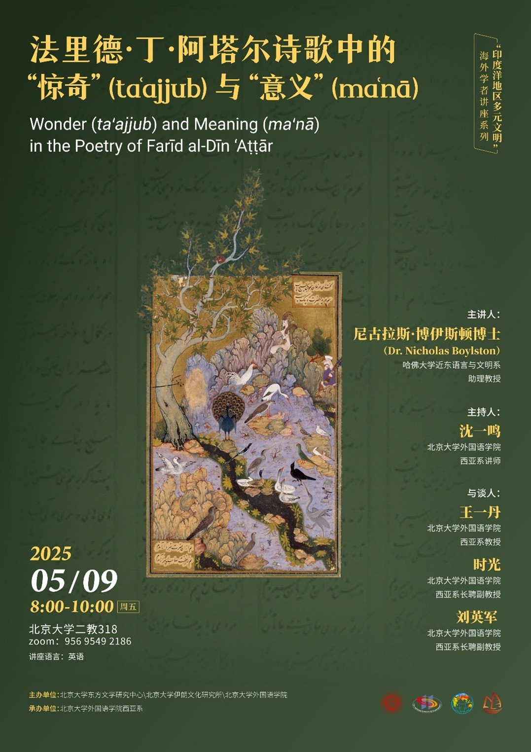 2025年5月9日上午,哈佛大学近东语言与文明系助理教授尼古拉斯·博伊斯顿博士(Dr. Nicholas Boylston)在线上为北京大学师生做了主题为“法里德·丁·阿塔尔诗歌中的‘惊奇’(ta‘ajjub)与‘意义’(ma‘nā)”的讲座。本次讲座是“印度洋地区多元文明”海外学者讲座系列之一,由北京大学东方文学研究中心、北京大学伊朗文化研究所和华体网主办,华体网西亚系承办。讲座由华体网西亚系讲师沈一鸣主持,西亚系教授王一丹、长聘副教授时光、长聘副教授刘英军与谈。到场的还有波斯语专业本科生,以及来自北京大学中文系、历史学系和经济学院等院系的师生。