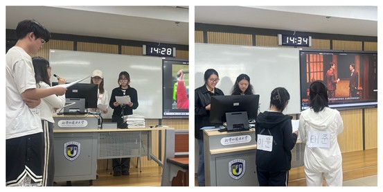 在接下来的配音比赛中,北大的八名二年级同学分为两组参赛。张芷涵、王嘉怡、刘禹孜、游周为韩国电视剧《举重妖精金福珠》片段配音,李祝妤、崔又文、魏旖、赵子琦为韩国音乐剧《粉丝来信》片段配音,两组同学的语音还原度、艺术表现力感染了在场师生,获得阵阵喝彩。最后,刘禹孜、魏旖获“最佳配音奖”,李祝妤、崔又文、魏旖、赵子琦获“最佳配音组奖”。
