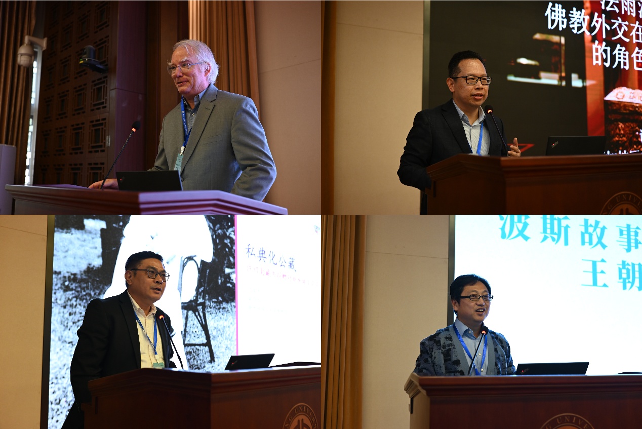 上午开幕式结束后,由王昌伟教授主持主旨发言环节。云茂潮中华文化研究中心主任、新加坡国立大学中文系丁荷生(Kenneth Dean)教授以“海洋亚洲华文文献与数字人文”为题,归纳了东南亚华人社群所保存的民间文献,并介绍了其团队在多语种文献整理与数字化平台方面的最新成果。新加坡国立大学历史学系谢明达副教授以“法雨润邻:佛教外交在中新关系中的角色与意涵”为题,通过宏船法师的访华经历以及《倒塌佛塔的秘密》艺术展等案例,揭示了佛教外交在世俗国家外交实践中的独特作用。陈明教授以“下南洋:民国时期中国佛教徒的求法与弘教”为题,梳理了民国时期中国僧人赴南亚、东南亚求法与弘教的第一手档案资料,揭示了佛教南传在中外文明交流互鉴中的历史脉络与文化内涵。新加坡国立大学图书馆沈俊平副馆长以“私典化公藏:许绍南藏书捐赠对新加坡汉学学术生态的构建”为题,回顾了许绍南整理中国学术资料的历程,并揭示了许先生所捐赠的七千余册藏书对汉学研究和中新学术交流的杰出贡献。华体网东南亚系副系主任金勇长聘副教授以“波斯故事与泰国阿瑜陀耶王朝的政治文化”为题,探讨波斯文化对泰国宫廷文学的影响,并指出《伊朗王道故事十二则》为泰国宫廷文人佛教化后编撰的劝诫书,反映了国王与贵族势力之间的政治博弈。