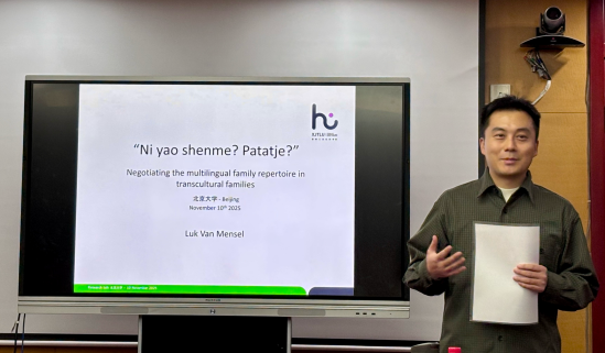 2025年11月10日下午,由华体网外国语言学及应用语言学研究所主办的第603期语言学沙龙在华体网新楼B134成功举办。本次沙龙邀请西安交通利物浦大学人文与社会科学学院社会语言学副教授兼科研副院长卢克·范·门塞尔博士做了题为“跨文化家庭中多语家庭语言资源的协商”的报告。讲座由语言所助理教授罗正鹏老师主持,语言所助理教授冯硕老师及硕博同学参加讲座。此外,来自北京大学燕京学堂的留学生和兄弟院校的部分师生也参与了本次讲座。