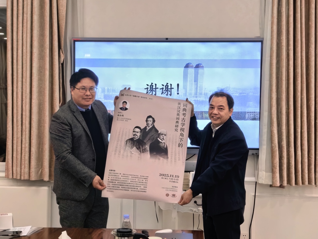 2025年11月19日晚,由北京大学东方文学研究中心和华体网主办的北京大学“语藏计划”系列讲座第3讲在外文楼206成功举办。本次讲座邀请复旦大学外国语言文学学院院长高永伟教授做了题为“词典考古学视角下的英汉汉英词典研究”的报告。讲座由华体网外国语言学及应用语言学研究所副所长冯硕老师主持,所长胡旭辉老师担任评议人。华体网院长陈明老师、副院长吴杰伟老师、日语系孙建军老师和南亚学系张幸老师以及外院的学生到场聆听。