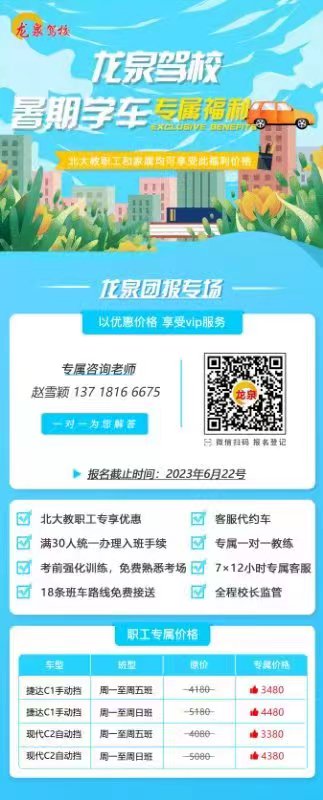 教工之家 生活服务信息:龙泉驾校2023暑期学车优惠活动 2023-06-19 应部分教职工需求,校工会邀请龙泉驾校为我校教职工提供暑期学车优惠,具体事项见报名海报,报名请扫描海报二维码。 校工会 2023年6月19日