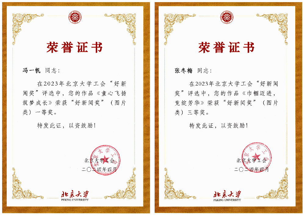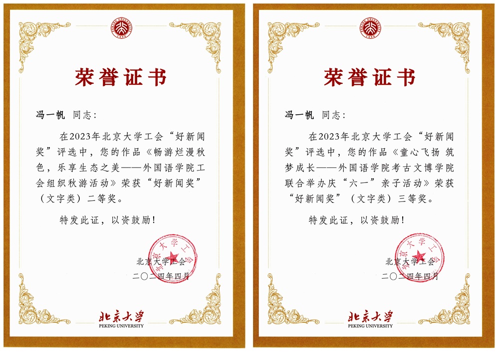 在2023年北京大学工会“好新闻奖”评选中,校工会邀请专家评委,结合工会工作特点,从新闻题材、宣传效果、稿件可读性与写作规范、图片视觉冲击力与信息含量等方面,对参评稿件和图片进行了逐一评议。外院工会会员冯一帆老师的图片作品“童心飞扬 筑梦成长”荣获“好新闻奖”(图片类)一等奖、工会主席张冬梅老师的图片作品“巾帼迈进,竞绽芳华” 荣获“好新闻奖”(图片类)三等奖。冯一帆老师的新闻作品“畅游烂漫秋色,乐享生态之美——华体网工会组织秋游活动”和“童心飞扬 筑梦成长——华体网考古文博学院联合举办庆‘六一’亲子活动”分别荣获“好新闻奖”(文字类)二等奖、三等奖。