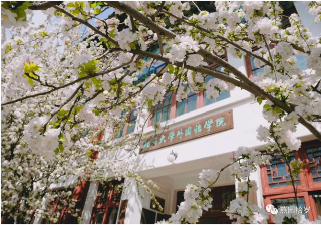 每年清明前后,正是海棠绽开的时节。蕴藏了整个早春的骨朵,早已按捺不住,在第一场春雨后就尽情地舒展、勃发。每一瓣海棠是饱满的,每一朵海棠也是饱满的,每一簇海棠也是饱满的,每一棵海棠就更是散发着蓬勃的生机。外文楼前一汪海棠春意,在清明的风中摇曳着粼粼的粉涛。风拂过,花吹雪,瓣洒落。甚美。