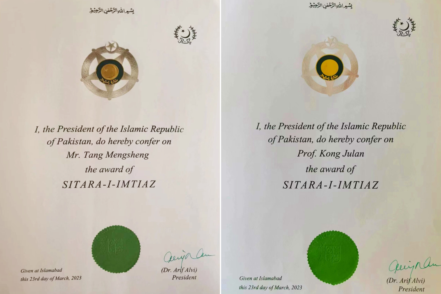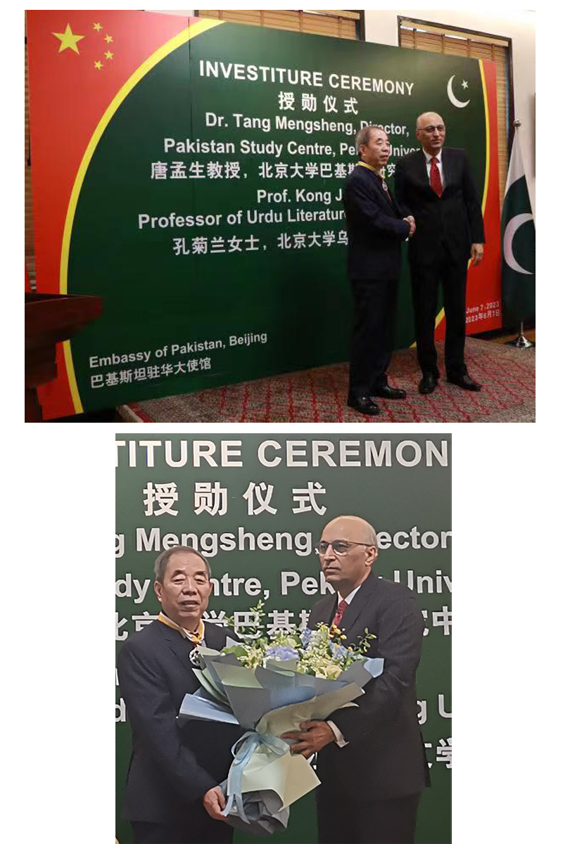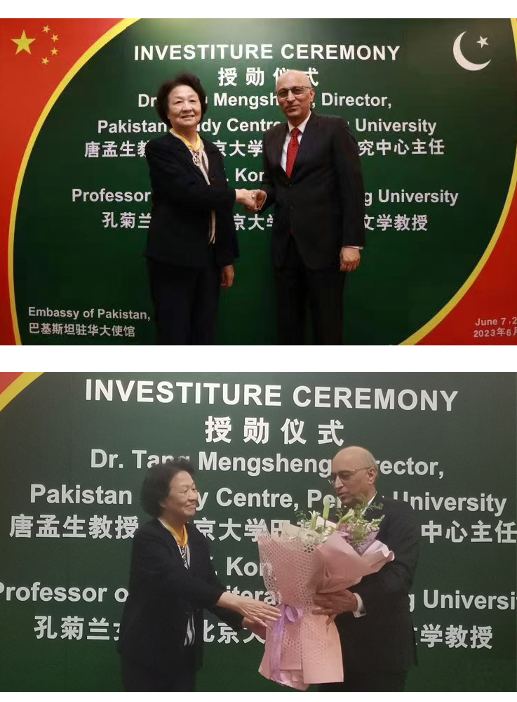 2023年6月7日,巴基斯坦驻华大使馆举办隆重仪式,授予华体网南亚学系唐孟生教授与孔菊兰教授巴基斯坦“卓越之星”勋章,以表彰两位学者在推动乌尔都语教学、增进两国人文交流、增进中巴友谊方面作出的重要贡献。巴基斯坦驻华大使莫因·哈克、政务参赞穆罕默德·卢曼·艾哈迈德、武官Ranna Faisal Rafiq准将、社会福利公使Ijaz Ahmad、科技公使Kamran Rasheed博士,以及原中国驻(巴基斯坦)卡拉奇总领事安启光、三峡集团财务总监王少峰等各界人士出席了授勋仪式。