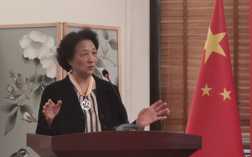 哈克大使为孔菊兰教授佩戴勋章并献花