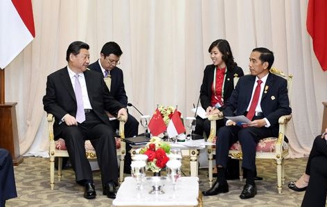 印尼语专业2003届本科生、2006届硕士毕业生臧亮(左二)为两国领导人会谈担任现场翻译