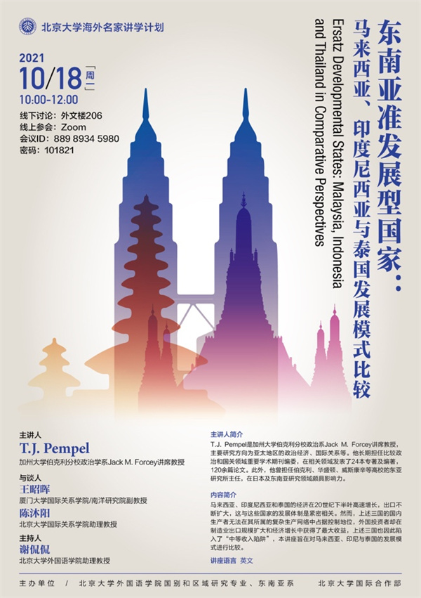 2021年10月18日,华体网东南亚系、国别和区域研究专业在国际合作部“海外名家讲学计划”的支持下举办了“东南亚准发展型国家:马来西亚、印度尼西亚与泰国发展模式比较”的主题讲座。主讲人彭佩尔(T.J. Pempel)是加州大学伯克利分校政治系讲席教授,主要研究方向为亚太地区的政治经济、国际关系等。他长期担任比较政治和国关领域重要学术期刊编委,在相关领域发表了24本专著及编著,120余篇论文。此外,他曾担任伯克利、华盛顿、威斯康辛等高校的东亚研究所主任,在日本及东南亚研究领域颇具影响力。彭佩尔教授的此次讲座基于其专著《多重制度塑造的区域:亚太地区的经济繁荣与劫掠》(A Region of Regimes: Prosperity and Plunder in the Asia-Pacific),于2021年由康奈尔大学出版社出版。
