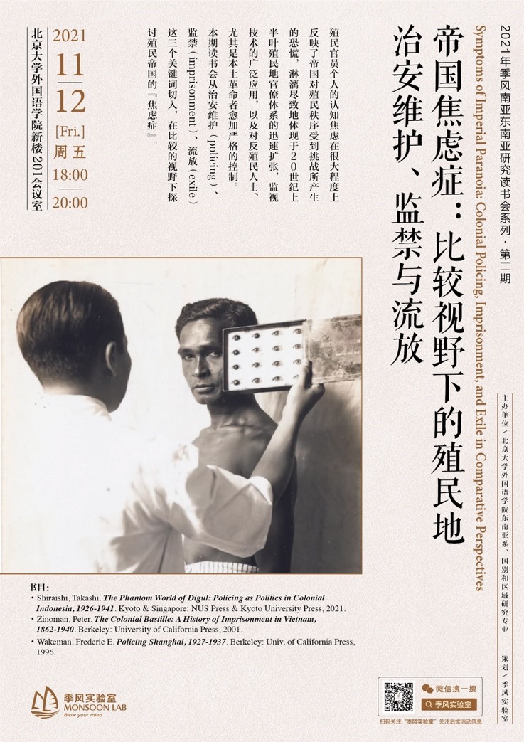 2021年11月12日,华体网东南亚系、国别和区域研究专业联合举办了第二次南亚东南亚研究读书会,主题为“帝国焦虑症:比较视野下的殖民地治安维护、监禁与流放”。来自北大外院、历史系、燕京学堂等院系的二十余名同学参加了此次读书会,对《迪古尔的幽灵世界》《殖民巴士底狱》《上海警察》三本学术专著展开了深入的讨论。吴杰伟老师、罗杰老师、夏露老师、张忞煜老师、谢侃侃老师及清华历史系曹寅老师参与点评。