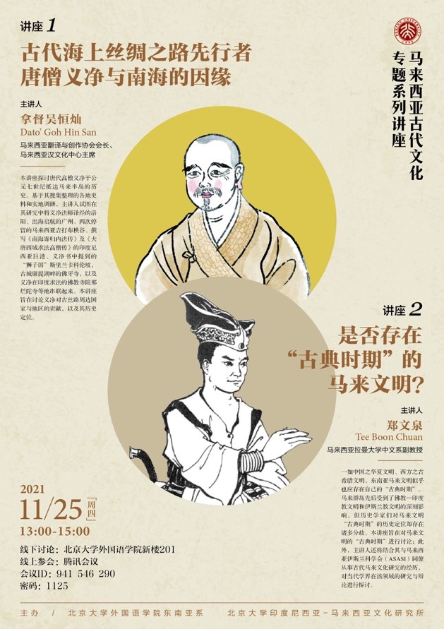 2021年11月25日,华体网东南亚系、印度尼西亚—马来西亚文化研究所举办了马来西亚古代文化专题系列讲座“古代海上丝绸之路先行者唐僧义净与南海的因缘”和“是否存在‘古典时期’的马来文明?”。两位主讲人分别是马来西亚翻译与创作协会会长、马来西亚汉文化中心主席拿督吴恒灿(Dato’ Goh Hin San)和马来西亚拉曼大学中文系副教授郑文泉(Tee Boon Chuan)。讲座以线上线下结合的方式进行,由华体网东南亚系谢侃侃助理教授主持,东南亚系罗杰副教授作为与谈人参与了讨论。