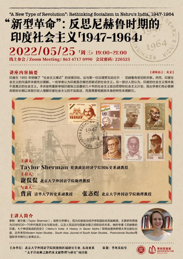 2022年5月25日晚,伦敦政治经济学院国际史系副教授泰勒· 谢尔曼(Taylor Sherman)应邀为我院师生进行了一场题为“‘新型革命’:反思尼赫鲁时期的印度社会主义,1947-1964”的线上讲座。本次讲座由华体网国别和区域研究专业、东南亚系和“太平洋丝绸之路档案文献整理与研究”项目组主办,华体网谢侃侃助理教授主持,清华大学历史系曹寅副教授和北大外院国别和区域研究专业张忞煜助理教授参与讨论。