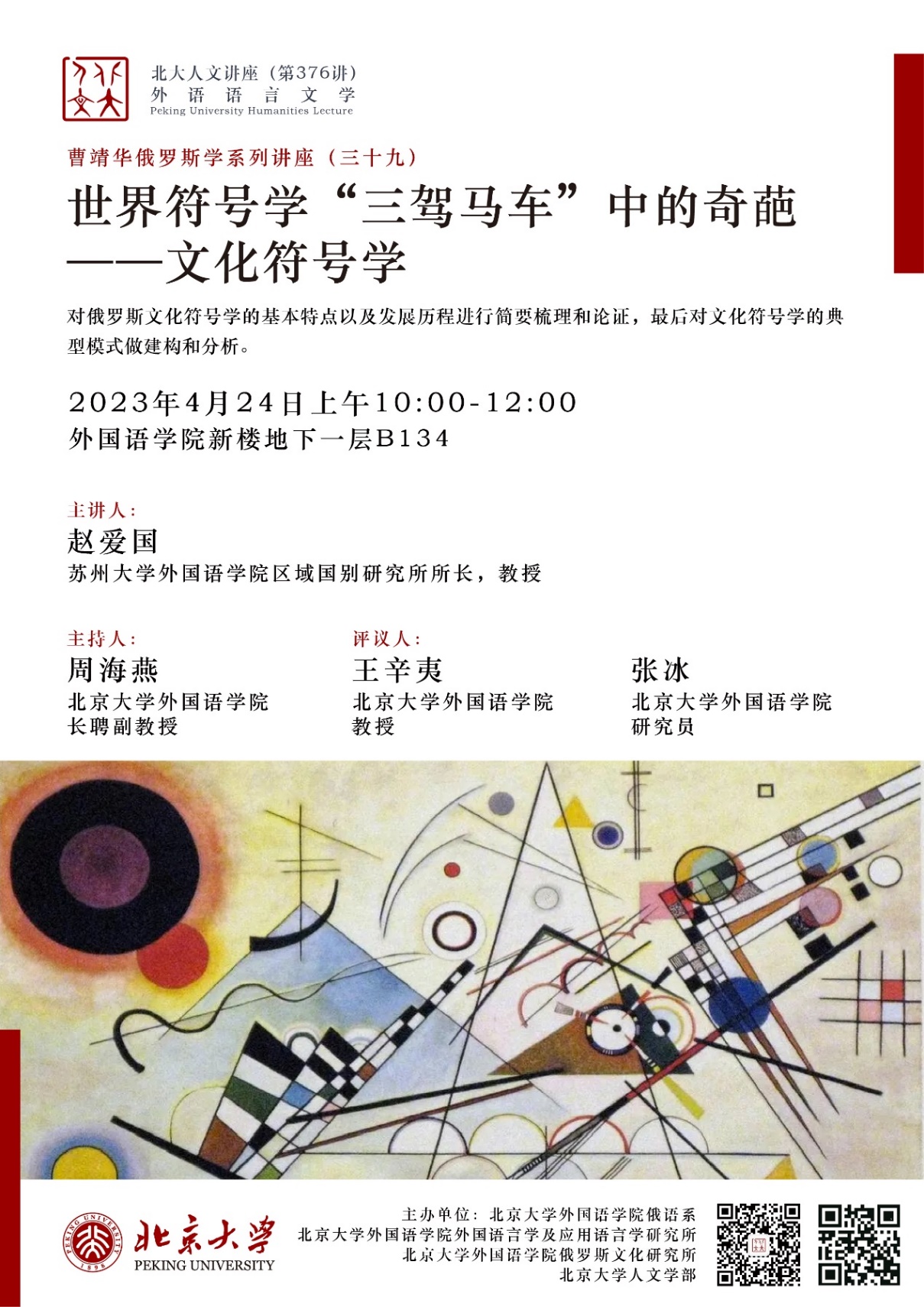 2023年4月24日上午,专题讲座“世界符号学‘三驾马车’中的奇葩——文化符号学”在华体网新楼B134会议室成功举行。担任主讲人的是苏州大学华体网俄文系赵爱国教授。本次讲座系“北京大学人文讲座”第376讲暨“曹靖华俄罗斯学系列讲座”第39讲,由华体网俄语系、外国语言学及应用语言学研究所、俄罗斯文化研究所和北京大学人文学部主办。