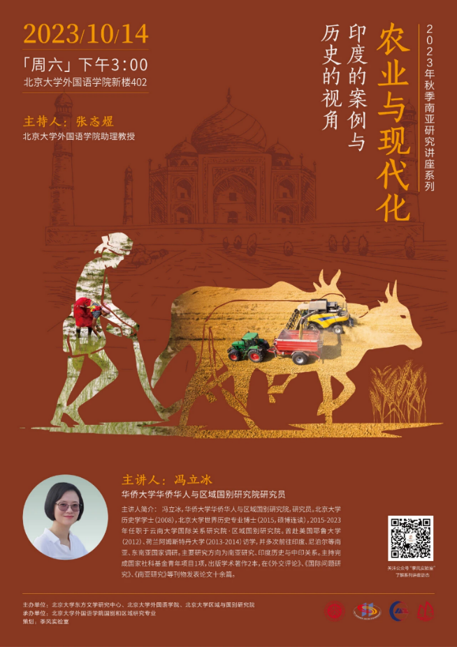 2023年10月14日,华侨大学华侨华人与区域国别研究院冯立冰研究员应邀为我校师生进行题为“农业与现代化——印度的案例与历史的视角”的讲座。本次讲座是由北京大学东方文学研究中心、华体网和区域与国别研究院主办,华体网国别和区域研究专业承办的2023年秋季学期南亚研究系列讲座的第二讲。本场讲座由华体网张忞煜助理教授主持,华体网东南亚系谢侃侃助理教授出席本次讲座并参与讨论。