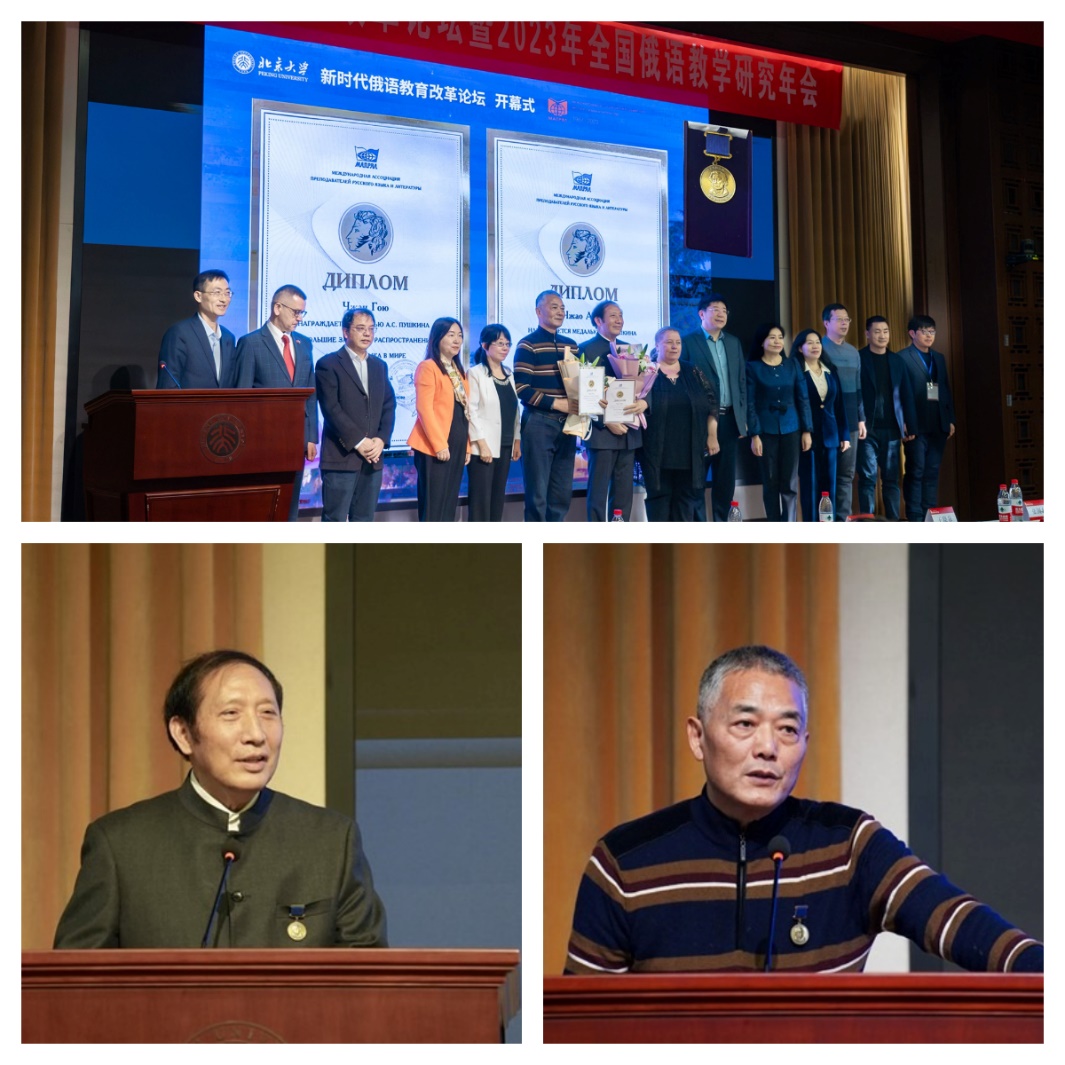 2023年9月,世界俄语学会授予北京大学张国有教授、苏州大学赵爱国教授“普希金奖章”。该奖项于1977年设立,授予在俄罗斯境外为推广俄语、俄罗斯文学和文化做出杰出贡献的俄罗斯本土和外国的社会和国务活动家、学者、教师。本次论坛开幕式上,宁琦教授代表世界俄语协会向张国有教授、赵爱国教授颁发了“普希金奖章”和证书,两位教授发表了获奖感言。
