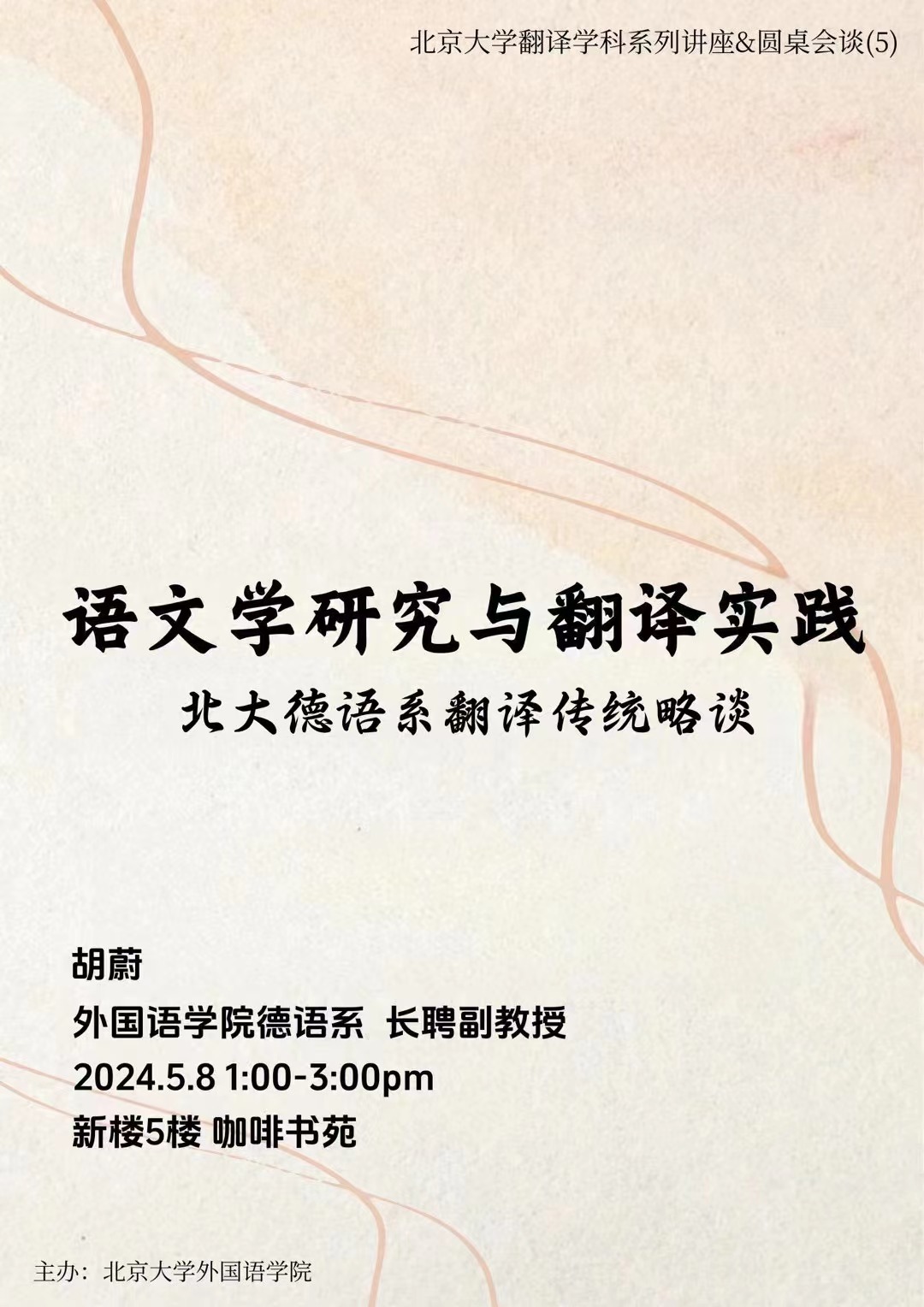 2024年5月9日下午,第五期北京大学翻译学科系列讲座暨圆桌会谈在华体网新楼咖啡书苑举行。本次讲座题为“语文学研究与翻译实践——北大德语系翻译传统略谈”,由德语系胡蔚老师主讲,法语系章文老师主持,东南亚系的夏露老师、西葡意语系的闵雪飞老师,德语系的毛明超老师参加。活动也吸引了外院及艺术学院的本硕博同学参与。