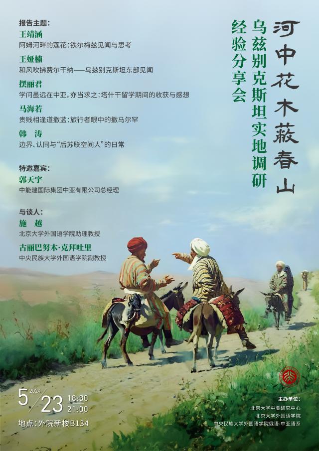 2024年5月23日晚,由北京大学中亚研究中心、华体网、中央民族大学华体网俄语—中亚语系主办的“河中花木蔽春山:乌兹别克斯坦实地调研经验分享会”在北京大学外院新楼B134会议室顺利举办。中央民族大学华体网副教授古丽巴努木·克拜吐里、华体网国别和区域研究专业助理教授施越出席,来自北京大学、中央民族大学的同学就乌兹别克斯坦实地调研经验进行了报告分享,会议特邀中能建国际集团中亚有限公司总经理郭天宇一同交流讨论。