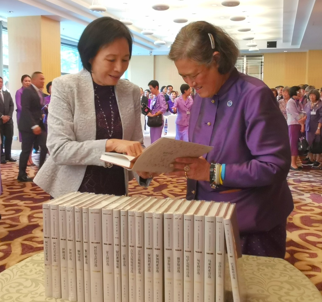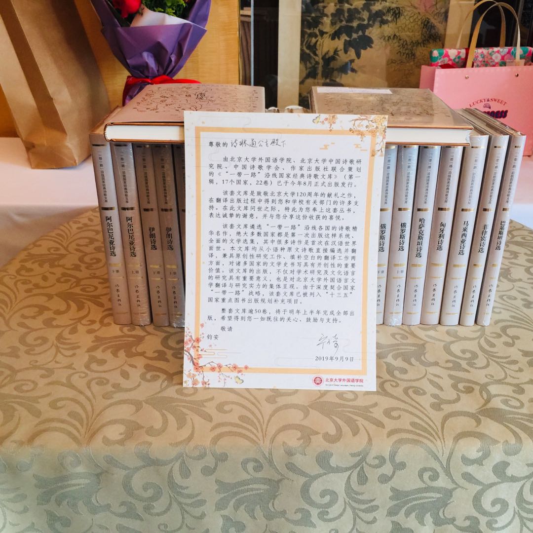 2019年9月29日下午,泰王国诗琳通公主在参加完中华人民共和国国家勋章和国家荣誉称号颁授仪式之后,前往北京丽思卡尔顿酒店宴请前任中国驻泰大使和公主的汉语教师代表。我国泰语界著名专家、翻译家、诗琳通讲席教授裴晓睿受邀参加了此次宴请活动,并作为译者之一向公主赠送了由北大华体网、北大中国诗歌研究院和作家出版社联合策划出版的《“一带一路”沿线国家经典诗歌文库》(第一辑)一套。