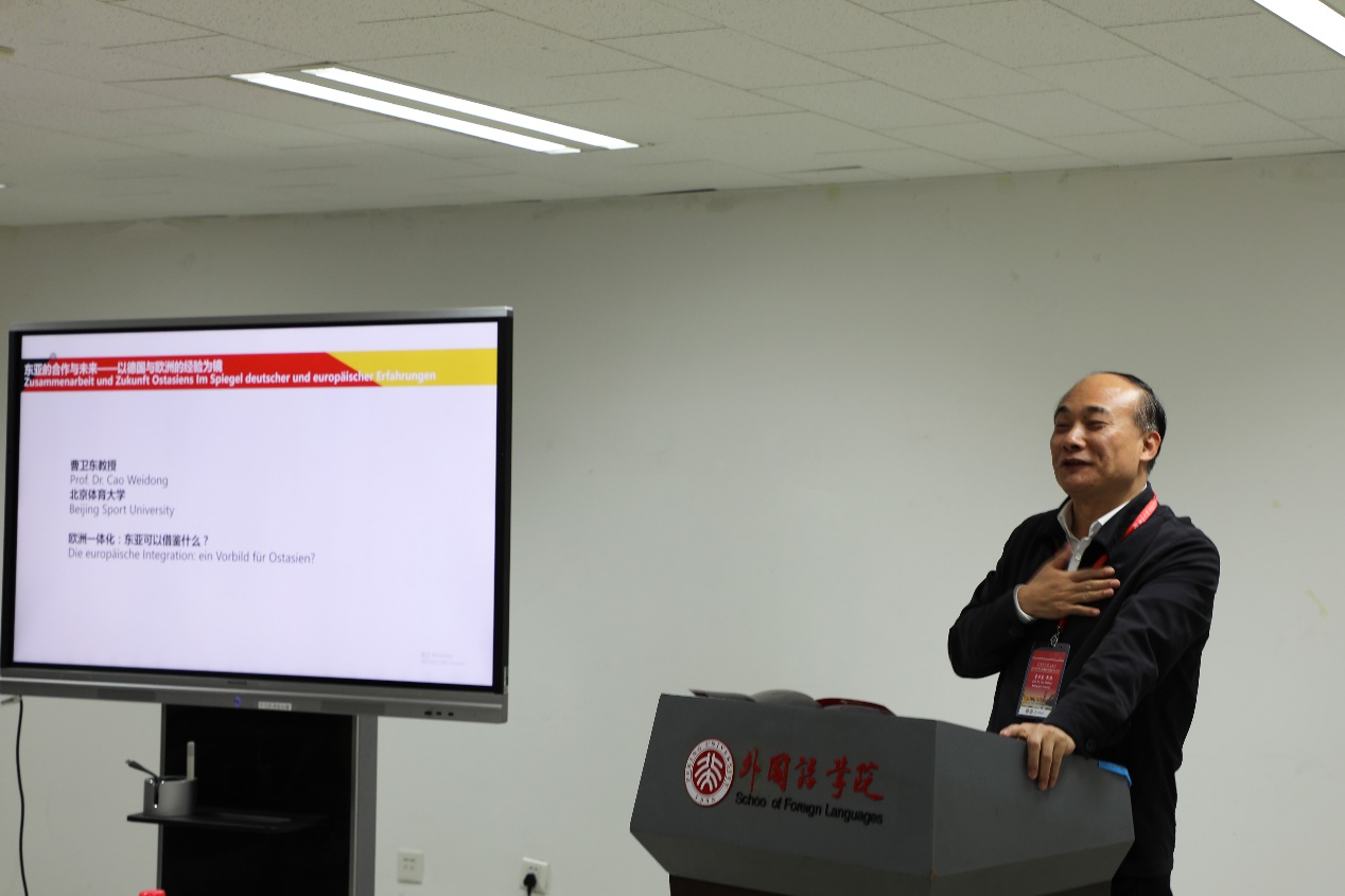 13日,德国法兰克福大学知名经济学家、北京大学人文社会科学研究院客座教授贝尔特拉姆·舍弗尔德教授关于中国经济思想的报告拉开了第二天会议的序幕。各国学者从历史出发,对德国统一与欧洲共同发展过程中所遭遇的社会问题进行分析,以德国与欧洲的经验为例,讨论了东亚经济一体化与贸易保护主义、朝鲜半岛问题及东亚各国在人文艺术领域的合作。极具时效性与现实价值的话题引发了与会学者的热烈讨论与广泛交流。北京大学德国研究中心成员,法学院王世洲教授、国际关系学院连玉如教授、德语系谷裕教授等均发表了各自的真知灼见。德语系毛明超助理教授出色地完成了会场的中德口译工作。