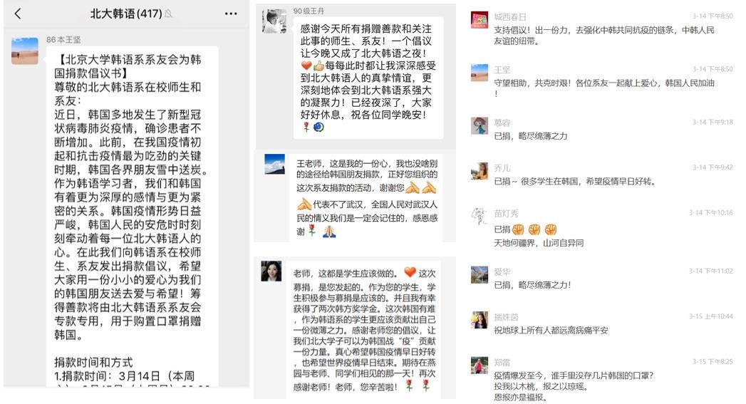 华体网韩语系系友会会长、86级系友王坚在发起捐款时表示,“守望相助,共克时艰!希望各位系友一起献上爱心,韩国人民加油!”华体网副院长、韩语系主任王丹教授为广大师生体现出的善意深深感动,“韩国,对我们每个人而言都有着不同寻常的记忆,我们所有学生自入学之日起,就与韩国结下了不解之缘。作为韩语学习者,韩国疫情形势和韩国人民的安危时时刻刻牵动着我们的心。这次,我们一起献上我们的爱心,希望能给韩国人民带去爱与希望。希望他们能够拥有更安全的学习环境,更希望他们和所有韩国人民能够早日摘下口罩,露出灿烂的笑脸。”武汉籍系友严格表示,“感谢系里组织本次活动,可以有途径向韩国朋友捐款。只是我的一点心意,代表不了武汉,全国人民对武汉的情意我们一定记住的。”在校博士生于美灵说到:“这次倡议,让我们北大学子可以为韩国抗疫贡献一份力量。真心希望韩国疫情早日好转,也希望世界疫情早日结束。”