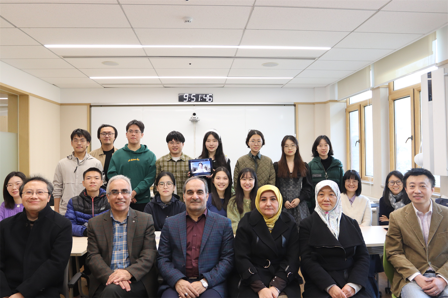 波斯语教研室教师王一丹、沈一鸣,博士后研究人员陈希等也围绕中伊文化交流、中伊学术互鉴、波斯语人才培养等主题与参赞一行作了深入交流。座谈结束后,宾主双方互赠了书籍和纪念品,参赞一行与波斯语专业到会全体师生合影留念。
