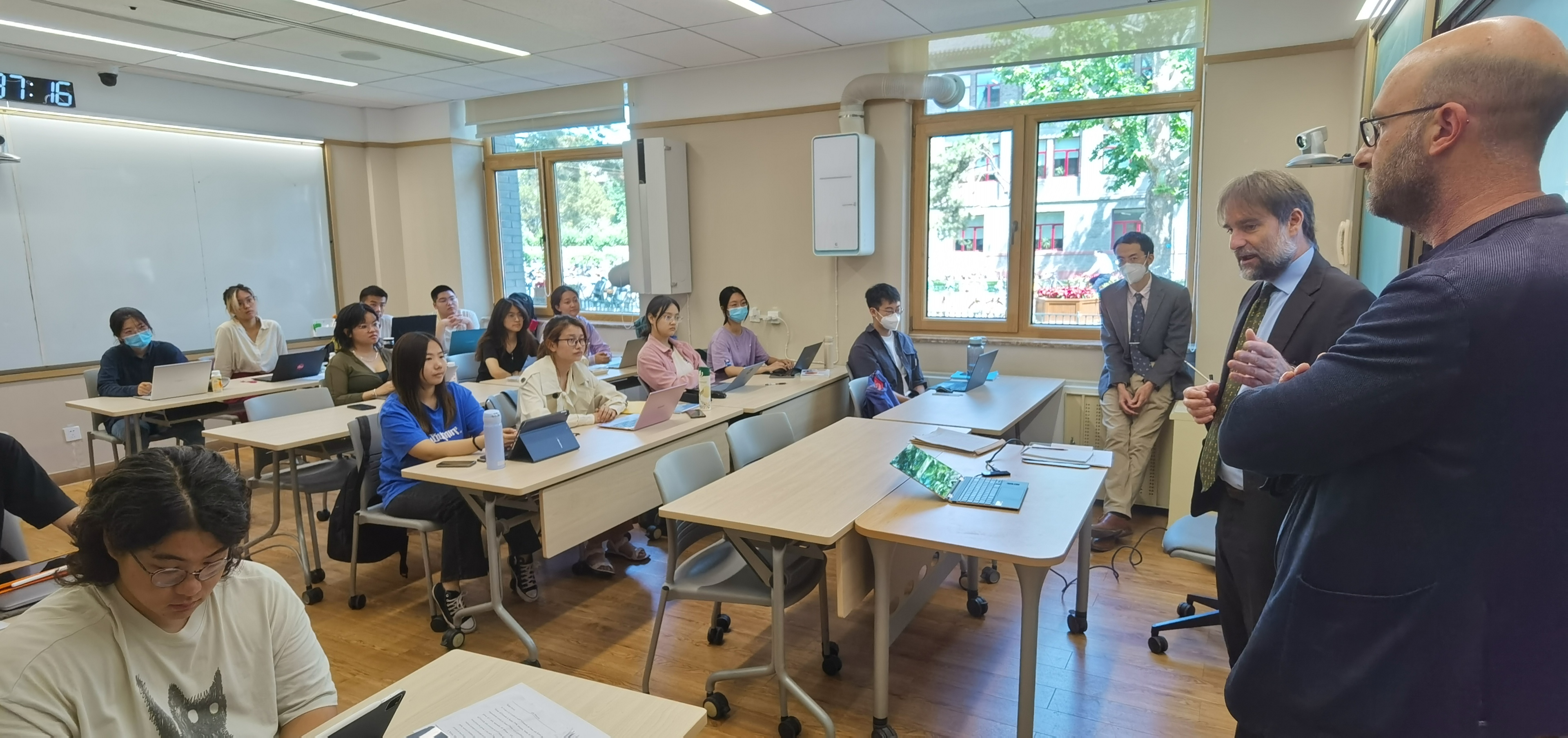 菲德利克参赞一行首先来到地学楼110教室,与意大利语专业的师生进行了座谈。参赞向同学们介绍了自己与中国及北京大学的渊源,并结合意大利的历史、艺术、音乐、饮食等不同领域,向同学们全面介绍了意大利文化以及当下中意文化交流活动的相关情况。同学们积极提问,探讨了中意两国大学及教育体系的异同、文化处的工作范围和文化活动的组织、意大利文化传统以及年轻人所关注的文化现象等话题,与参赞进行了深入交流。