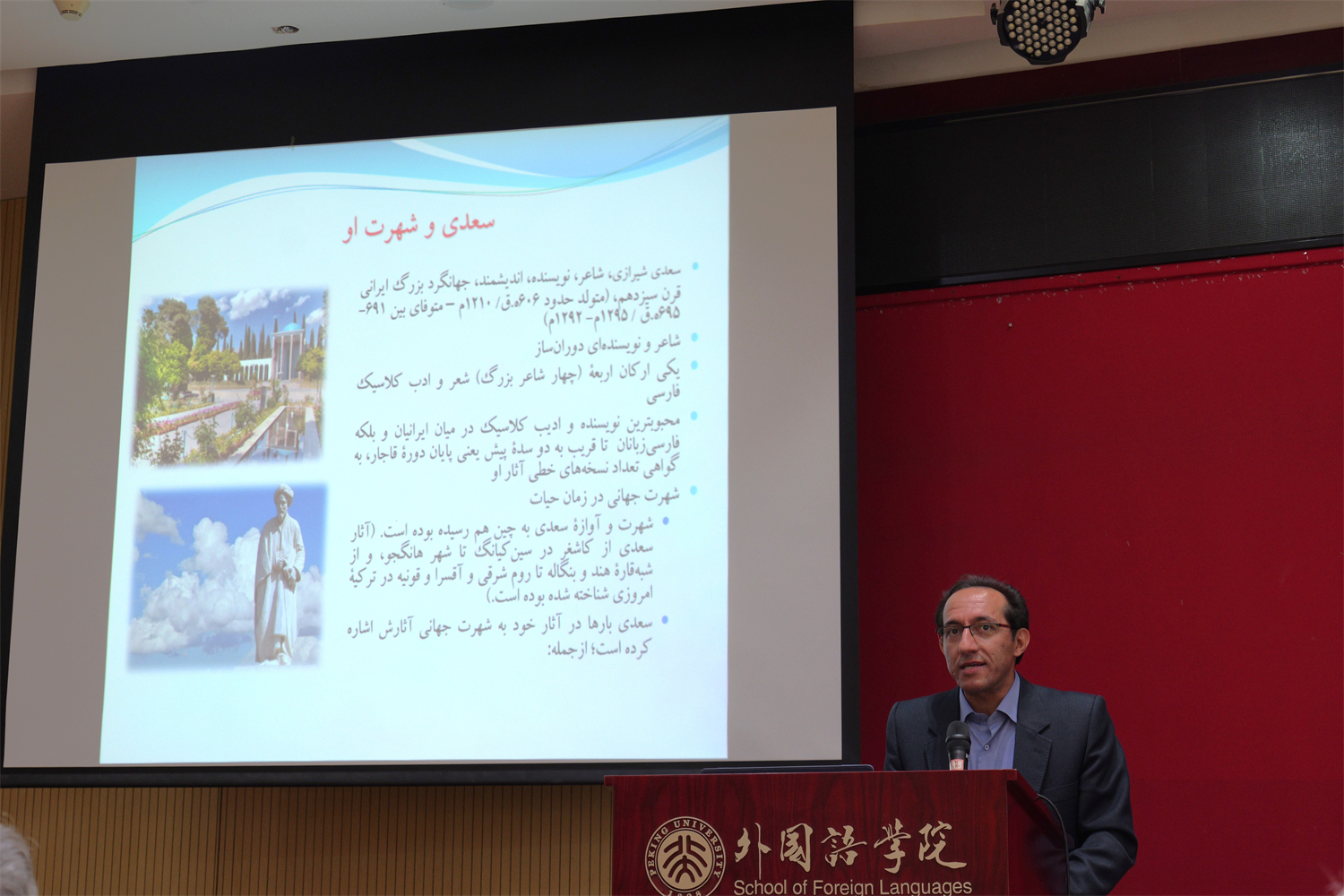 中国与伊朗两国拥有长达千年历史的贸易、政治和文化来往,萨迪的作品问世后很快传入中国,并产生了一定的影响力。贾拉利博士详细介绍了记录在中国汉文古籍、器皿、碑铭以及《伊本·白图泰游记》中的萨迪诗歌联句,同时整理了萨迪作品中译本的情况,并向大家展示了讲座中提到的部分抄本与碑铭的图片。留存于中国文化中的萨迪足迹,既证明了这位伊朗伟大诗人在历史上曾在中国具有一定影响力,也体现了中伊两国之间密切而友好的文化交往。贾拉利博士最后为在场师生诵读了一首优美的萨迪诗歌,结束了本次讲座。