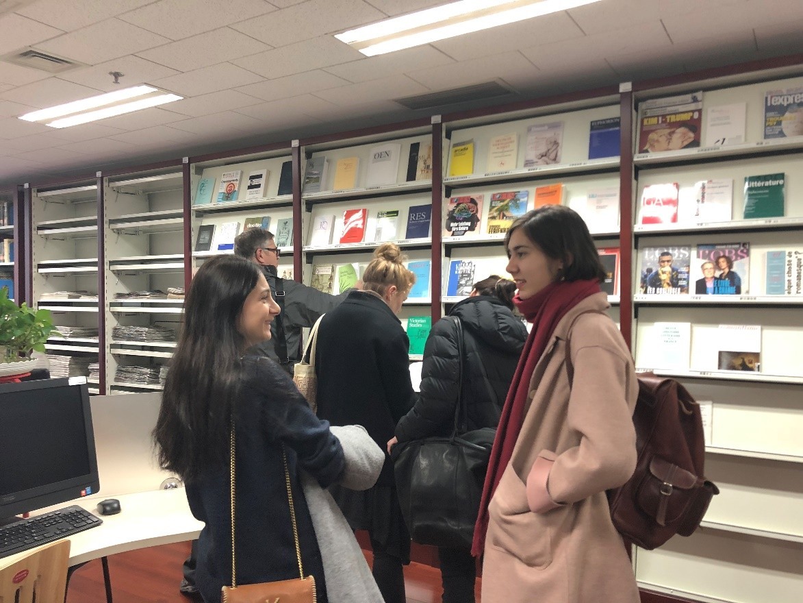 在交流及答疑之后,华体网图书分馆馆长张晓雁老师就学院图书分馆的发展历程、藏书量、服务政策等信息进行了详细介绍,并带领外籍教师们参观图书分馆。各位外籍教师就自己教学语种及研究方向的藏书情况、数据库资源向张老师进行了详细咨询。