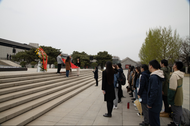随后,在中国人民抗日战争纪念馆副馆长董立新和华体网院友吕曦的带领下,师生来到抗战馆进行实地学习。清明时节寄哀思,在董馆长的指引下,师生在独立自由勋章雕塑前向先烈默哀致敬。董馆长表示,在建党一百年的关键历史节点,我们当代中华儿女应当“缅怀英烈志 奋进新征程 ”, 在缅怀先烈、寄托哀思的同时,更应当砥砺奋进,在新的一百年中创造新的辉煌。