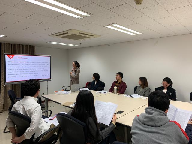 紧接着,支部开展了“学规矩、讲规矩、守规矩”主题教育知识竞赛。活动以中英文双语版的《中国共产党章程》为依托,设置了个人必答题、抢答题和小组讨论题等三种答题方式和选择题、填空题、判断题、翻译题等多种题型,从各个角度全面而具体地考察了硕博党员同学们对党章内容的理解。与此同时,支部考虑到英语系经常需要承担学校和学院交给的外事翻译工作,鼓励硕博党员同学们主动提前学习相关英文表述,时刻做好准备,传播党的精神,讲好党的故事。与会党员对《党章》等文件中重要表述的英文翻译进行了积极热烈而富有洞见的讨论,纷纷意识到政治文本的翻译远远超越学术的范畴,而更涉及民族文化的体现和国家形象的展示。