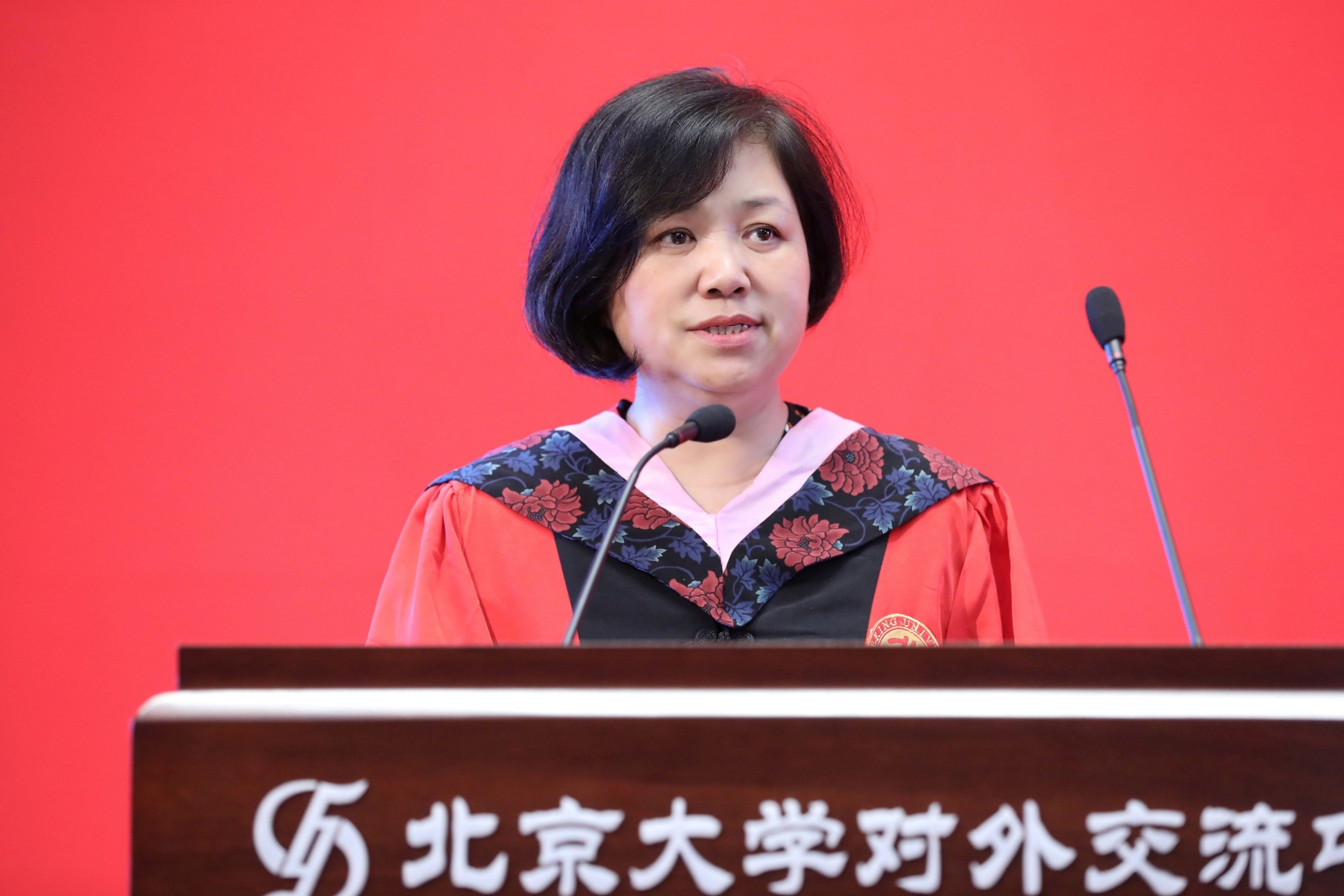 在热烈的掌声中,院长宁琦为毕业生同学们送上深情寄语。她回忆了与同学们一同度过的美好时光,同学们青春的活力、潜能与担当让她倍加感动,深受鼓舞。宁琦提到,今年是中国共产党的百岁生日,在新百年的起点上,更需要青年人以最大的热情拥抱这个伟大的时代。她用学院赵振江教授、申丹教授的事迹,勉励同学们树立“功成不必在我,功成必定有我”的激昂壮志,表达了对同学们到更广袤的天地中学习成长、到祖国最需要的地方去追梦圆梦、投身人类命运共同体建设的无限支持。宁琦鼓励同学们珍惜青春年华,保持对知识和真理的渴求,树立为祖国和人民奉献的远大志向,读懂精神传统,读懂使命责任,读懂自己,坚定信仰,不负青春韶华。