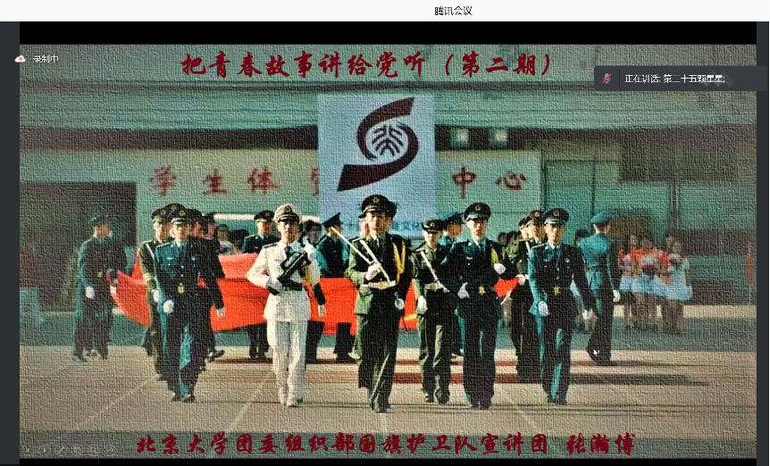 北京大学国旗护卫队宣讲团的张瀚博同学分享了他与国旗的故事。北京大学国旗护卫队成立于百周年校庆之际。国旗护卫队的成员们总是像战士一样“战斗”,传承北大人不变的责任与担当。在重组后的首次大型活动中,没有任何经验的同学们在雨中圆满完成任务的背后,是顶住课业的压力、克服身体的疼痛、默默无闻的付出和激扬的爱国情怀。他说道,每一位同学的心中都有着对祖国的热爱,需要找寻属于自己的方式去实现,并找到属于自己人生道路的那束光。