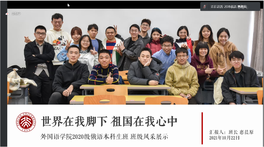 2020级俄语班在北京大学示范班集体评选中脱颖而出,被推荐参加北京市先进班集体的评选。班长惠晨原同学作为优秀班级代表,以“世界在我脚下,祖国在我心中”为题,展示班级建设风采。一年来,班级组织学习俄文版《习近平谈治国理政》读书会成效颇丰,与人大代表共话基层治理,参访校史党史旧址,加强师生交流互动。同时根据冬奥会志愿活动的安排部署,对缺课同学的学业支持采取“一人一策”,让志愿者后顾无忧。