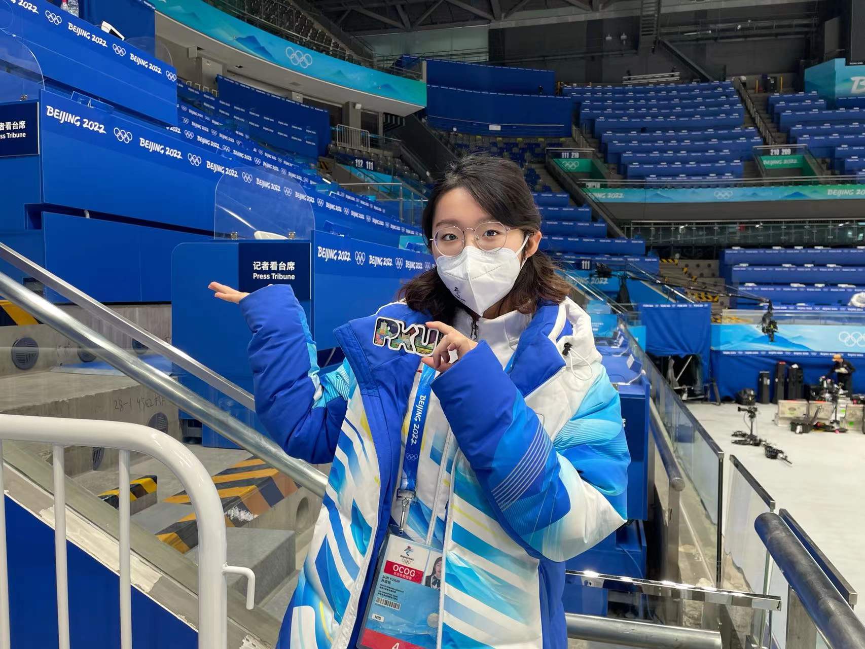 孙雨筠同学:2022年冬奥会中,外院志愿者覆盖7个场馆10个业务领域,我和惠晨原负责的都是媒体领域工作。我是记者看台席的助理。我的工作主要分为四部分:一、为来访记者提供CATV服务,控制CATV 转播显示器和内部操作;二、确保无关人员(转播商、摄影记者、队内人员等)不得进入看台区;三、赛中赛前为记者提供信息服务,赛前提供参赛阵容的信息,赛中提供每赛段的小结;四、引导服务,引导来到国家体育馆的各类人员。
