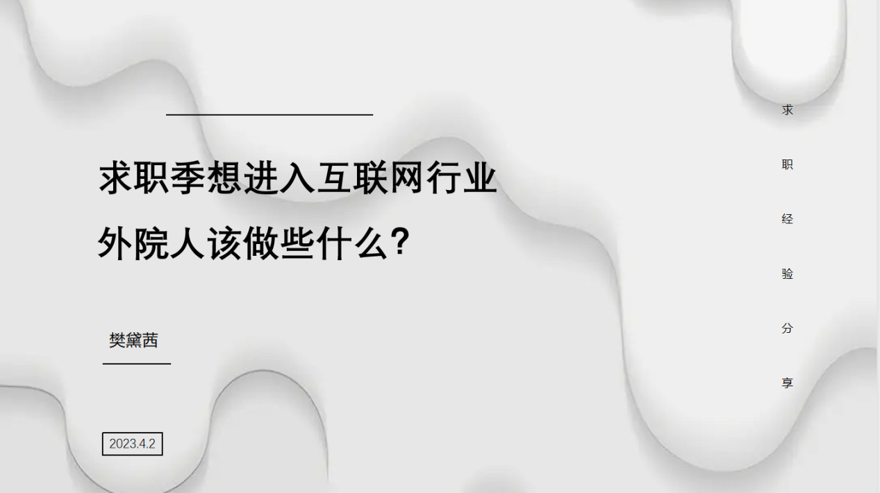人大外院2023届毕业生樊黛茜针对互联网行业的求职和就业做了分享。她以自己的实习与求职经历为例,分析了语言类学生在互联网行业可从事的岗位,其中非技术岗包括运营类、产品类、市场/职能类,语言直接相关的岗位包括翻译、技术文档工程师、本地化项目管理、语言教研等。语言类学生所具备的跨文化交流能力、分析研究能力、对热点的敏感度和人文情怀都是进入互联网行业的独特优势。樊黛茜建议大家以简历制作为导向,精心梳理校园经历、实习实践经历及其他可能有助求职的经历。她围绕网申、笔试、面试总结自己的经验心得,建议大家对照目标职位要求和行业普遍要求,多进行实战尝试,点亮自己的互联网技能树,以PAR法则梳理经历、量化成果,力求将其转化为自己的故事并体现在面试中。