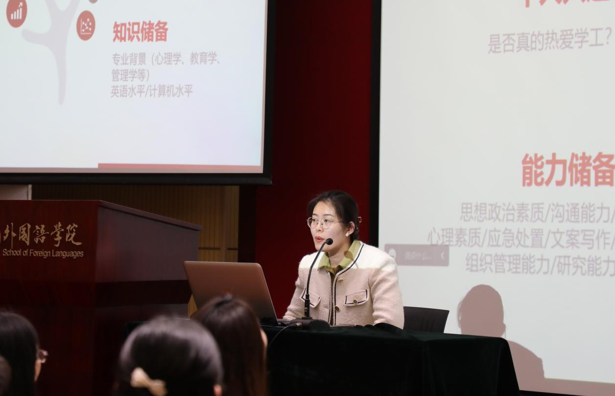 北大外院2020届毕业生门雪洁针对高校辅导员的求职和就业做了分享。她指出高校辅导员应当努力成为学生成长成才的人生导师和健康生活的知心朋友,因此需要极大的工作热情和相应的学工经历、能力储备与知识储备。谈到如何准备辅导员招聘,她从前期谋划、信息收集、笔试、面试四方面展开,建议大家在前期阶段进行职业测评,参与学生工作,参加公文培训和课题研究;通过加入求职互助小组和关注专项招聘网站,来获取辅导员工作文件,了解心仪院校往年招聘情况;在笔试阶段可参考国考的行测申论、辅导员工作案例、应聘学校的校史校情;在面试阶段需要提前准备自我介绍,练习结构化面试。她还向同学们推荐了高校辅导员联盟、高校思政网、思政热点等公众号,以便了解相关工作案例和前沿热点。