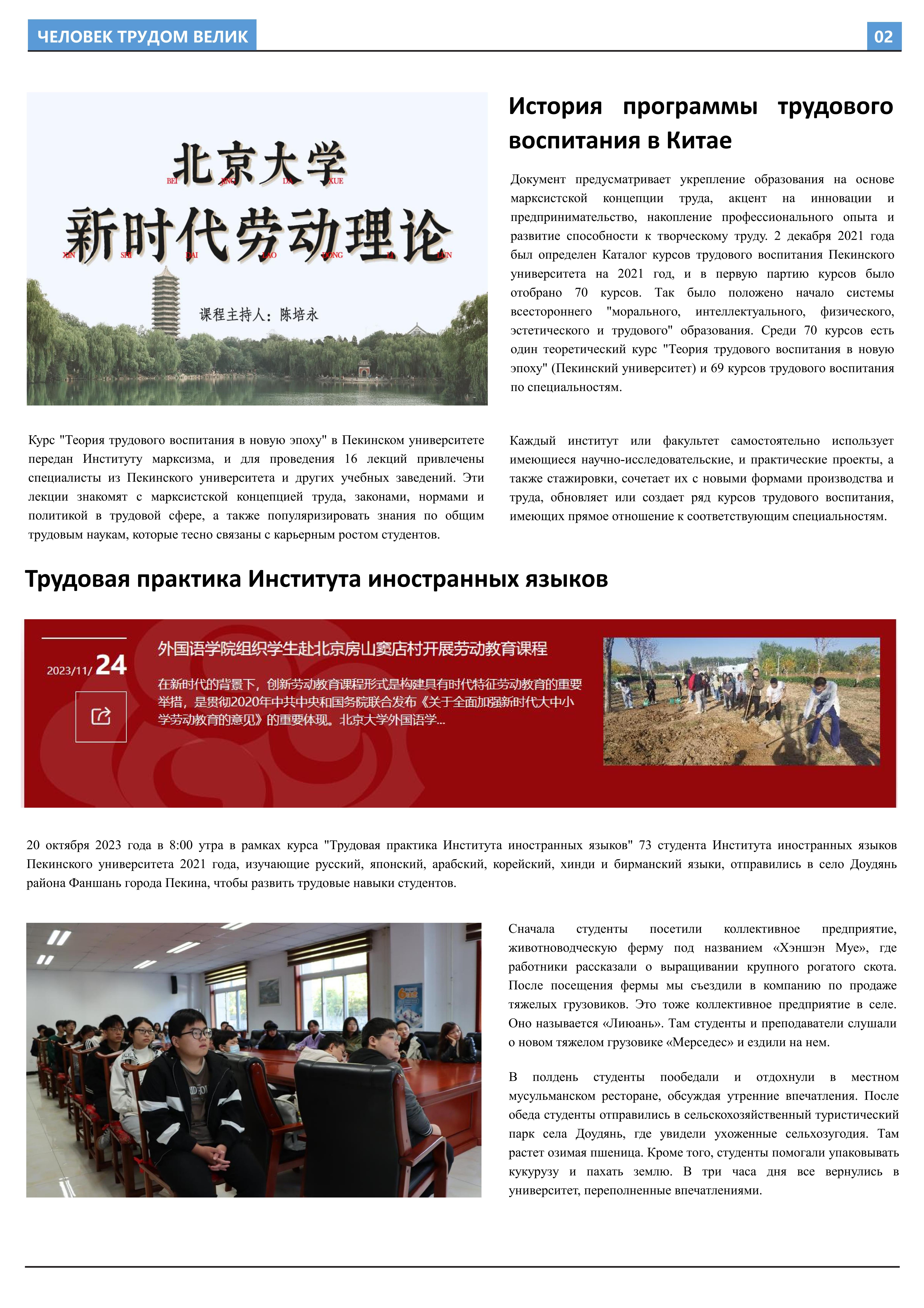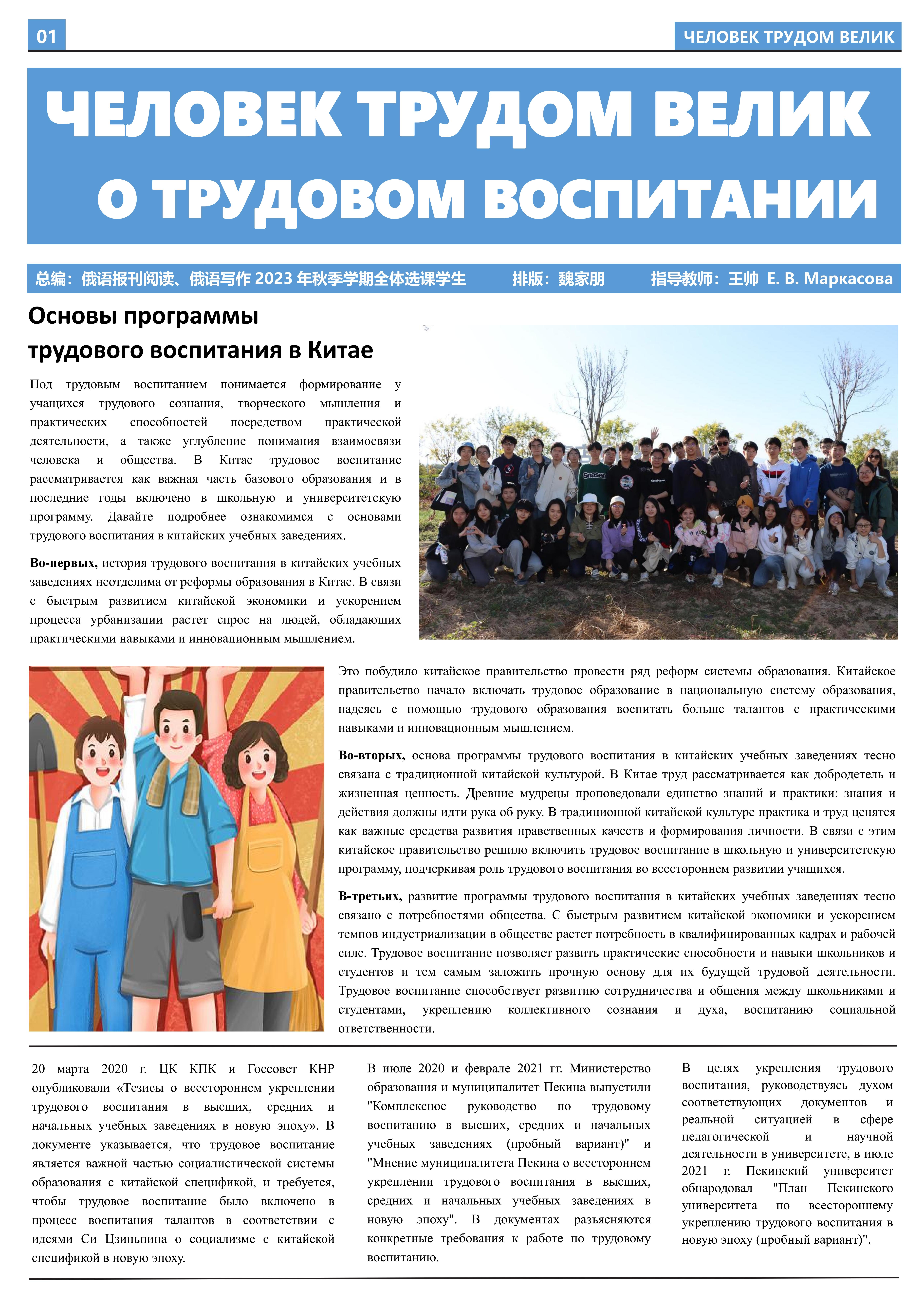 在接受劳动教育、参与劳动实践后,2023年10月至2023年12月,华体网2021级俄语本科生班的11名同学立足于学院平台和专业课堂(《俄语报刊阅读(上)》与《俄语写作(上)》),在两位课程主讲教师王帅和外教叶莲娜·马尔卡索娃(Елена Маркасова)的指导下,通过线上分工、小组讨论等形式商讨报纸细节,并学习使用重要概念和关键词句的俄语表达,历时近三个月,共同完成6个版面、3000余个单词数的“劳动成就人——关于劳动教育”主题报纸。报纸共分为8个大主题、13个小主题,全面介绍了华体网劳动教育课程的实施背景及学生参与情况,系统阐述了窦店村的历史文化与经济发展等多方面内容,并详细记录了同学们在窦店村恒升牧业畜牧养殖中心、窦店利元车业、农业观光园等劳动教学点的劳动实践与参访感受。