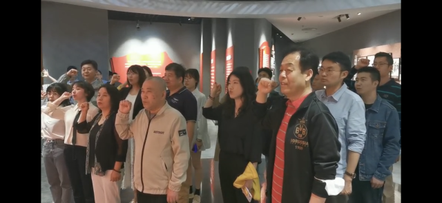 在展览现场,面对鲜红的党旗,付志明教授领誓,阿语系研究生党支部代表团全体党员举起右手庄严宣誓:“我志愿加入中国共产党,拥护党的纲领,遵守党的章程……永不叛党。”通过重温入党誓词,党支部成员进一步增强了自身的责任感和使命感,牢记“入党初心”,坚定了为共产主义事业奋斗终身的理想信念。