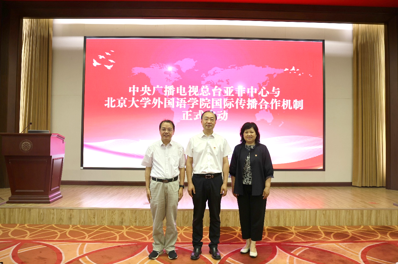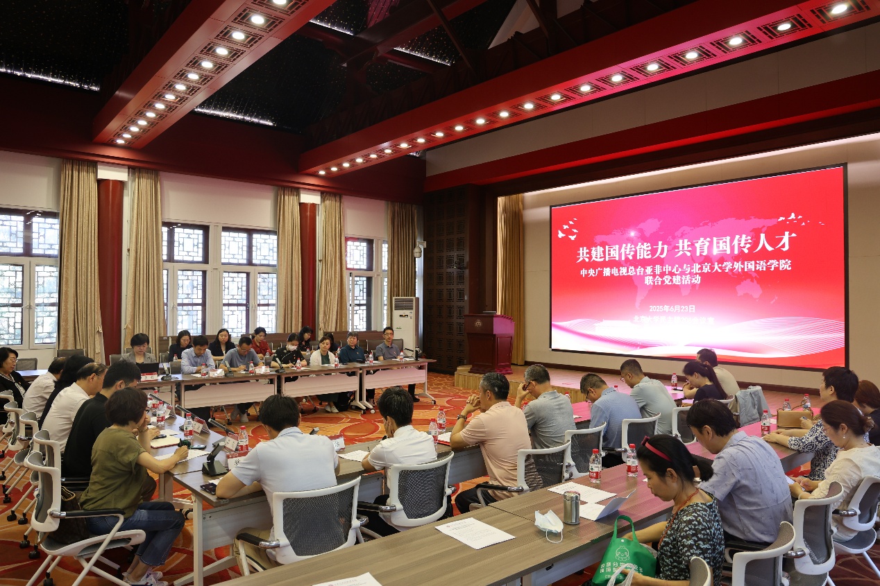 活动伊始,北大外院党委书记李淑静介绍学院在学科建设、人才培养及国际交流方面的成果。她指出,外语人才在国际传播中具有重要作用,是“讲好中国故事,传播好中国声音”的参与者和推动者。北大外院始终以服务国家战略为导向,致力于培养具有全球视野的复合型人才。两家单位以党建为基,已经开展了形式多样的联学联建,此次联合党建活动将成为双方合作新的里程碑。希望双方深化共建合作,携手共同谱写高质量发展的新篇章。随后,总台亚非中心党委书记安晓宇介绍中心情况,认为双方在“构建更有效力的国际传播体系”事业中有着广阔的合作空间。他强调,此次联学联建既是一次重温党史的机会,也是两家单位践行以高质量党建促进高质量发展的具体举措,也将成为双方共同提升国际传播能力建设的重要开端。希望以此次启动合作机制为契机,构建央媒与高校协同合作的新模式,共建国传能力,共育国传人才。