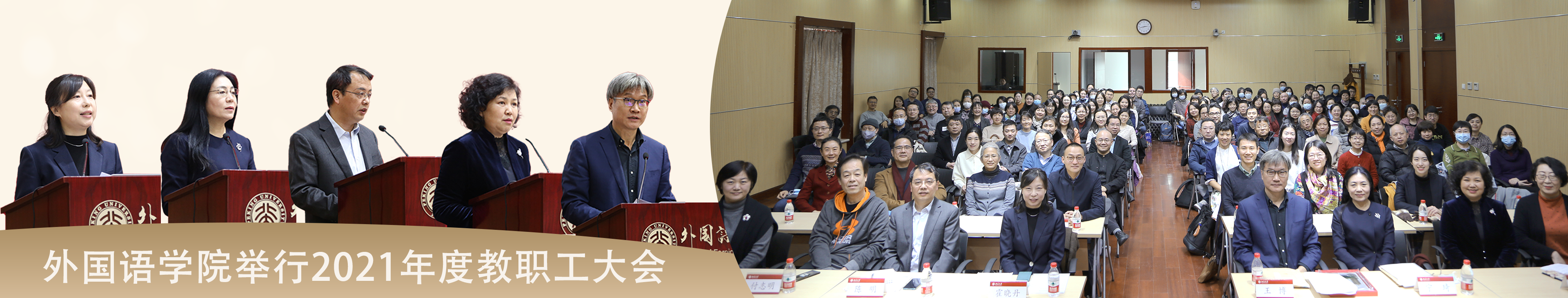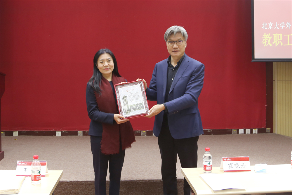 随后,李淑静代表学院党政班子向与会教师致新年贺辞。李淑静回顾了2021年外院取得的诸多成绩:学院师生在各类评比中屡创佳绩,特别是在前一天,第二批“全国高校黄大年式教师团队”名单公示,段晴教授带领的东方语言文化教师团队入选,极大地鼓舞了全院师生。外院精心培育具有前瞻性的科研项目,2021年获省部级以上科研项目13项。外院本科专业不断壮大,截止目前已入选国家级一流本科专业建设点19个,入选省级一流本科专业建设点2个。本年度外院本科教学、研究生教学、科研绩效、综合管理绩效评估均为A+,学院党委被评为北京大学先进党组织……2021年,8位教职工从工作岗位上荣休, 11位新同事加入外院大家庭。2022年,学院将迎来9位90岁寿星,3位80岁寿星。正值2021年最后一天,愿全体外院人在新的一年里继续携手并肩,昂首向前。