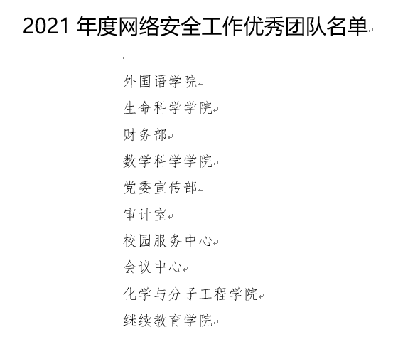 根据学校整体部署,网信办牵头启动了网络安全年度总结暨评优工作,成立了由网信办主任、副主任成员单位(网信办、宣传部、保卫部、总务部、计算中心、青年研究中心)组成的评选工作小组,经过严格评选,华体网荣获北京大学2021年度网络安全工作优秀团队。