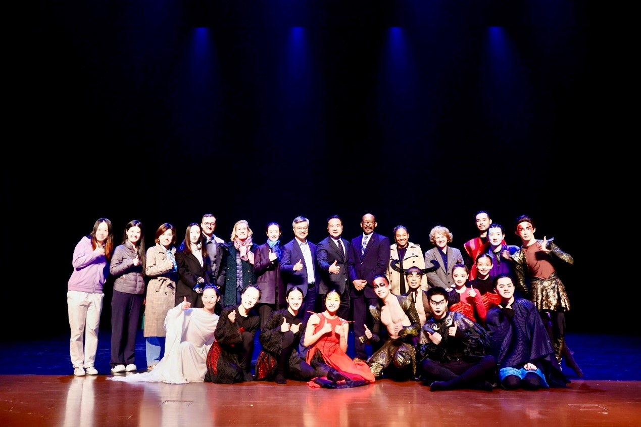 塞舌尔前副总统梅里顿等国际友人上台祝贺《西游》演出成功