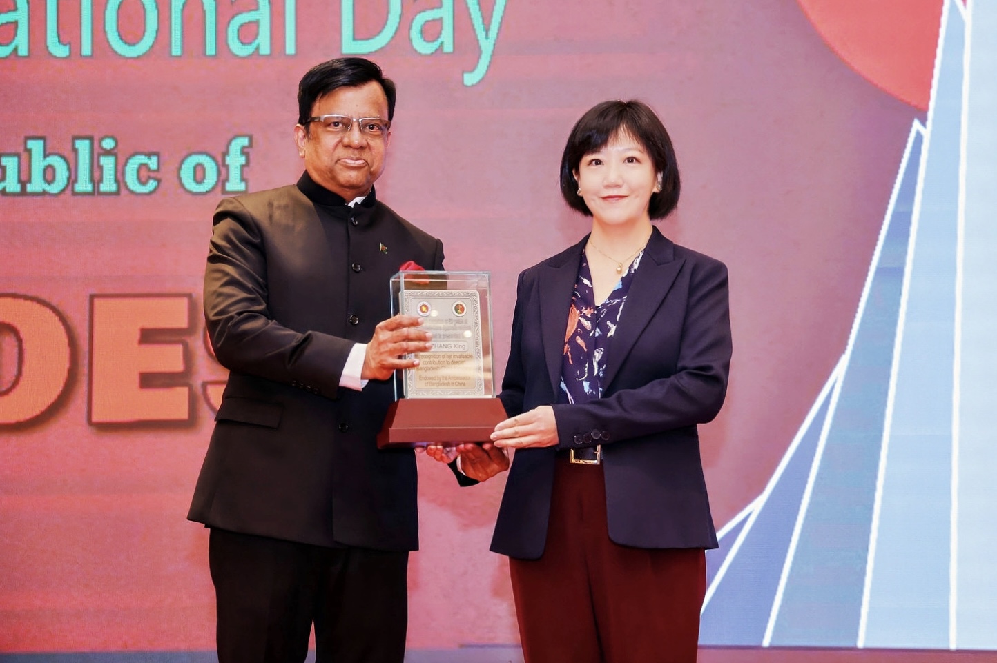 在中国与孟加拉国建交50周年之际,孟加拉国驻华大使纳兹穆尔(Md Nazmul Islam)于2025年4月9日在京举办的孟加拉国独立54周年国庆招待会上,颁授孟中建交50周年贡献奖,表彰为孟中友好关系作出突出成绩的中方五位个人和一个集体。华体网南亚学系南亚文化/孟加拉语教研室主任张幸副教授与四位中国前驻孟大使获得个人奖;中央广播电视总台孟加拉语部获得集体奖。