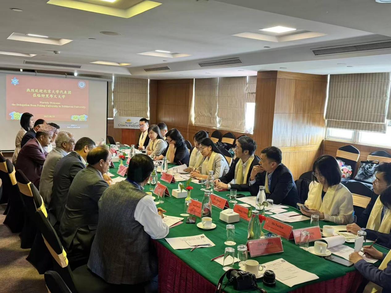 8月10日上午,调研团与尼泊尔特里布文大学(Tribhuvan University)联合举办主题为“跨越喜马拉雅的合作:北京大学-特里布文大学学术对话“学术会议。特里布文大学校长阿里亚尔(Deepak Aryal)教授盛赞北京大学在国际学术合作中的重要地位,并表达了与北大建立更紧密、全方位伙伴关系的强烈意愿。宁琦表示,北京大学愿与尼方科研机构携手,深化拓展高等教育合作,助力中尼人文交流取得更为丰富的成果。调研团成员王旭做了题为《彰显中国担当:推动新形势下跨喜马拉雅地区高质量合作》的报告,阐述了中国在新形势下推动跨喜马拉雅地区高质量合作的责任担当。吴杰伟做了题为《夯实基础,民心相通:中尼援助、旅游、教育合作》的报告,聚焦中尼两国在援助、旅游、教育领域的合作实践,强调夯实基础、联通民心的重要性。双方学者围绕中尼高校间的学生互访、联合科研、语言教学及文化交流等核心议题进行了深入探讨。